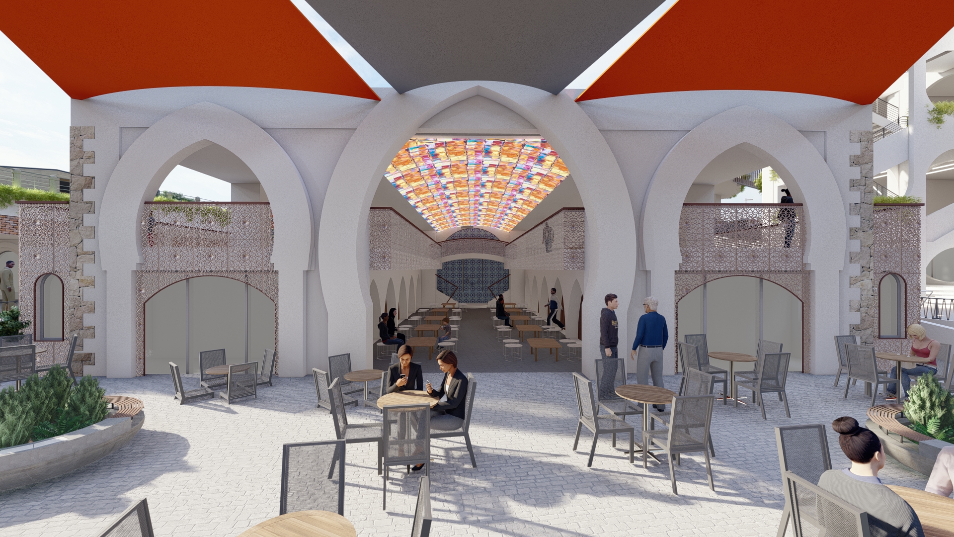 Hujrah Village has more than 400 parking spaces, 70 restaurants and cafes with spacious terraces, 15 drive-thru shops, 10 ATM drive-thru stations, +1000m² entertainment and play area, 2500m² of family walking area called "Mashaieh“.